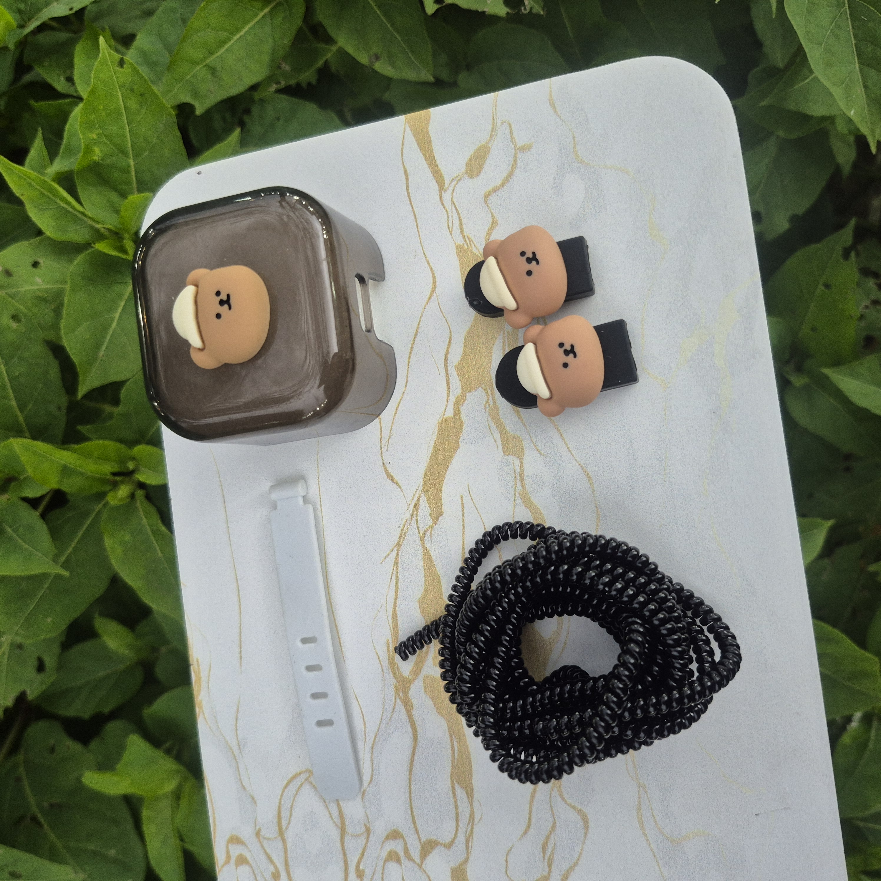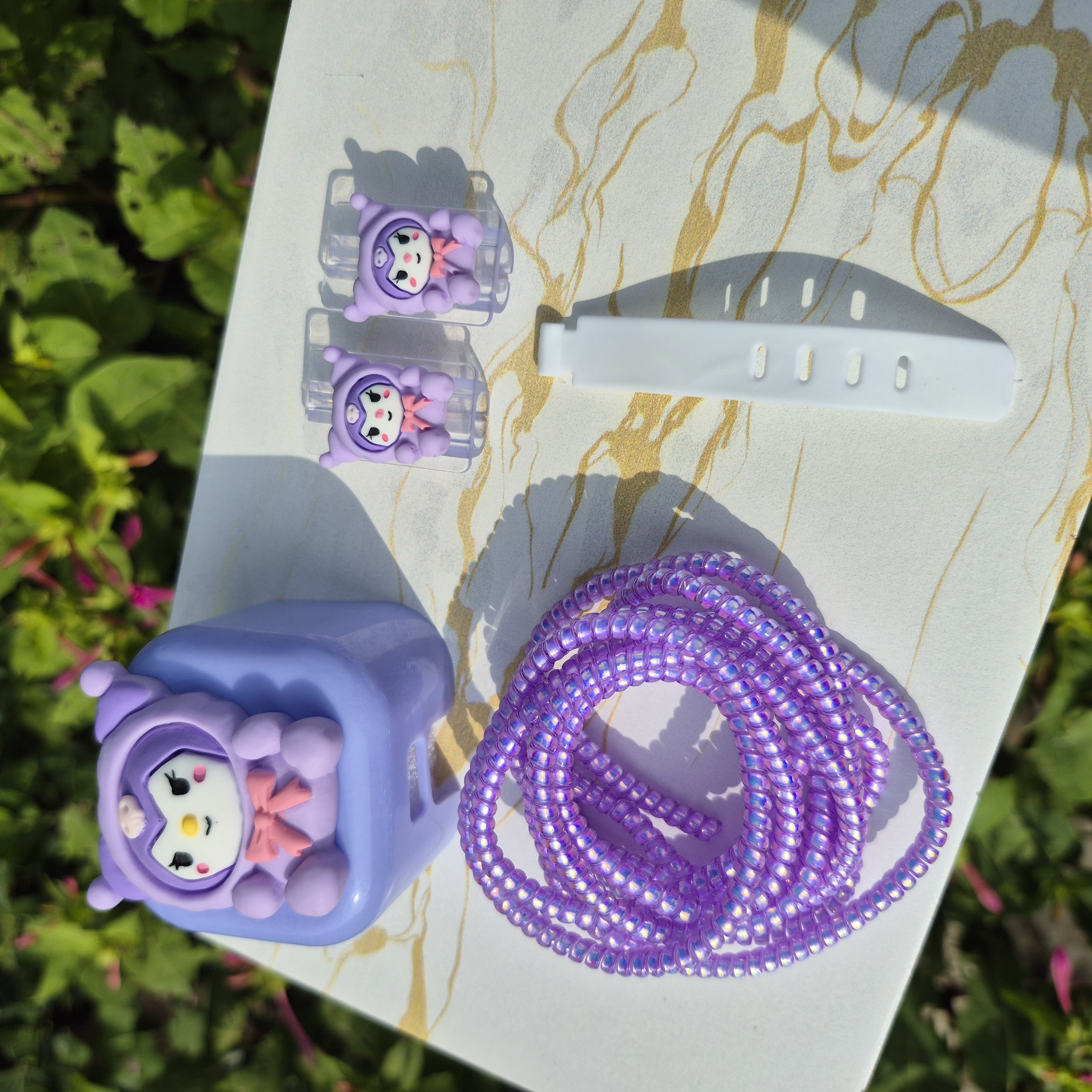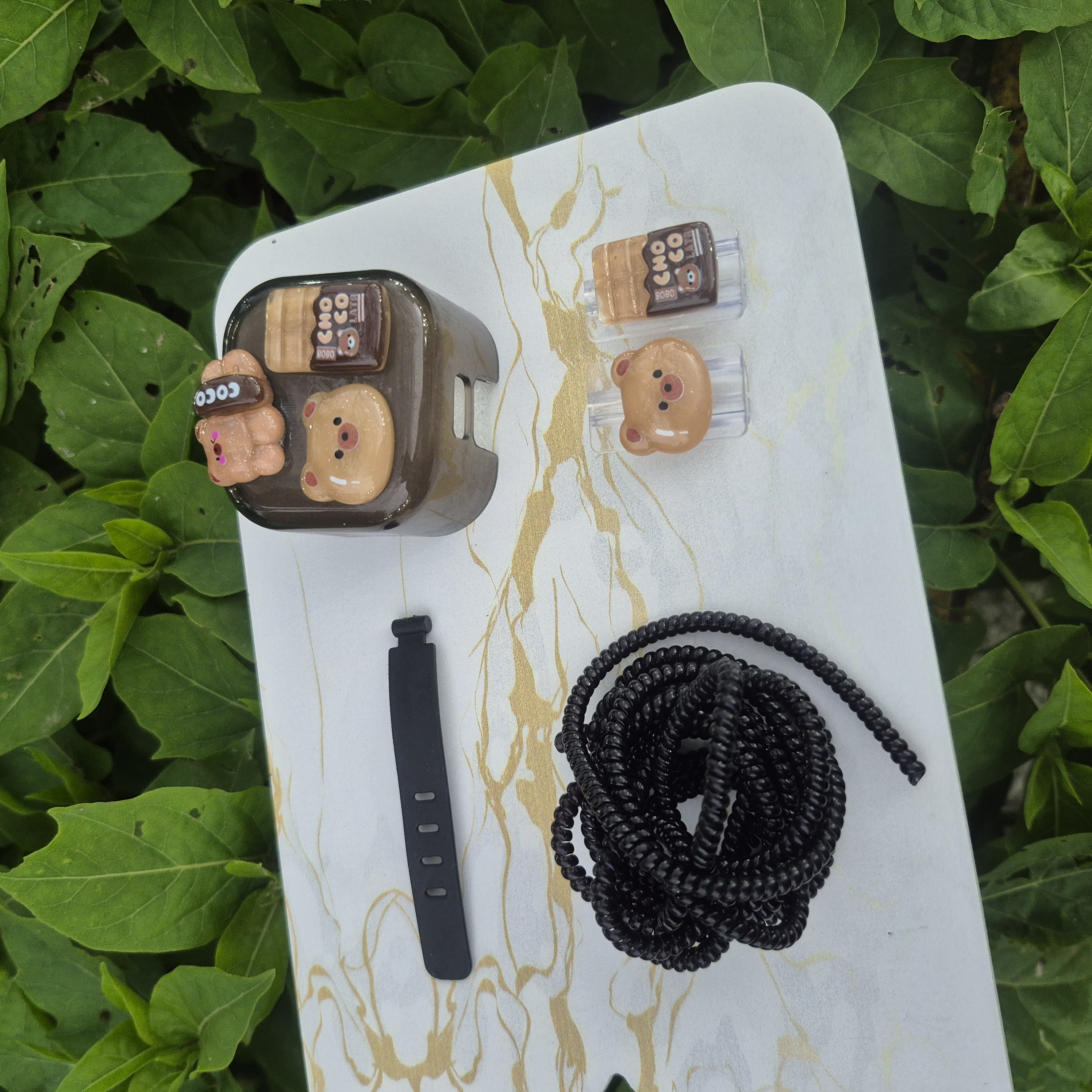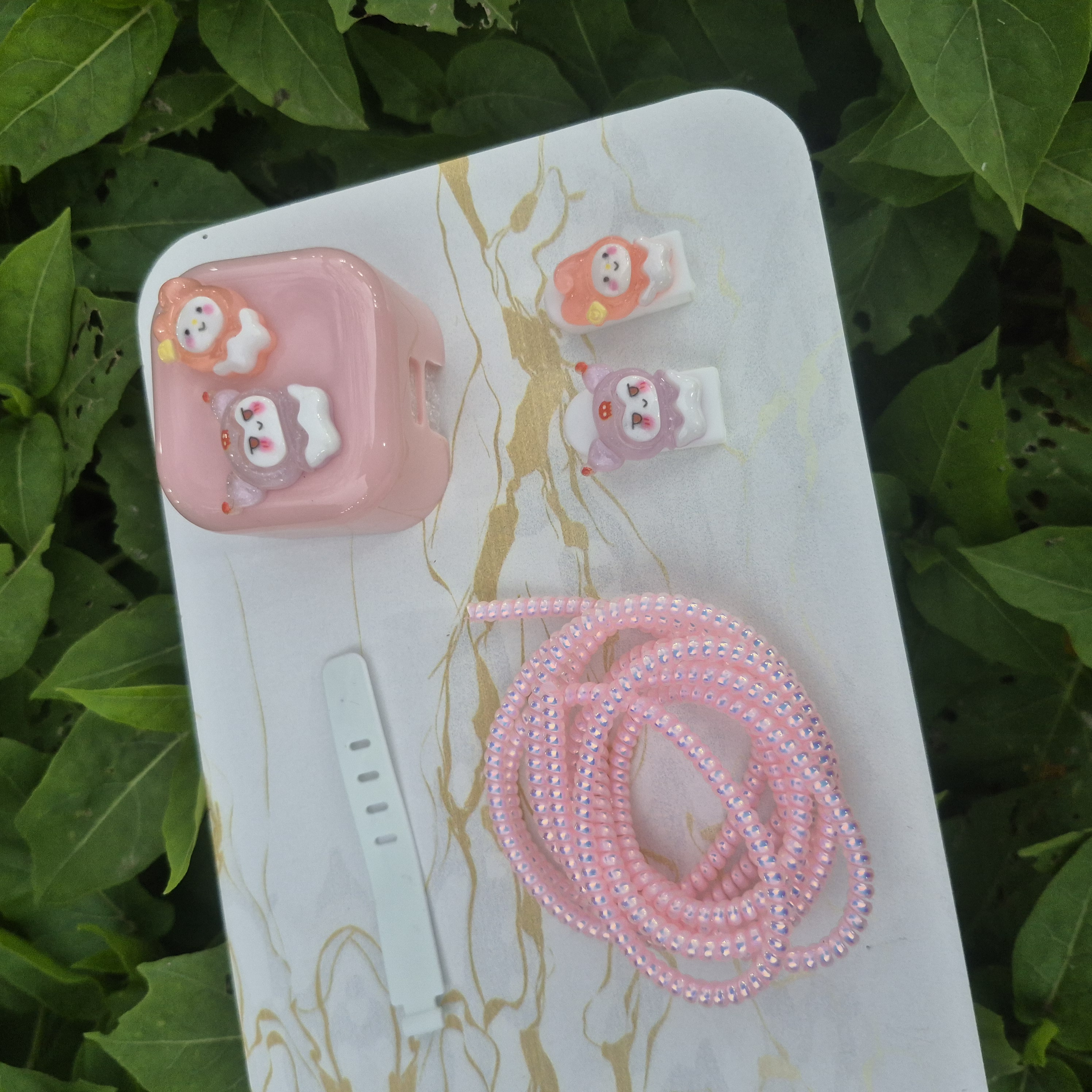 1 عدد محافظ آداپتورعروسکی+ 1 عدد محافظ کابل رنگی+1 عدد کابل جمع کن+2 عدد سر محافظ کابل عروسکی
